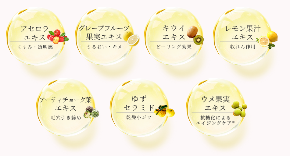 天然のフルーツアロマの香りもスキンケアタイムを癒しの時間に変えてくれる要素です。