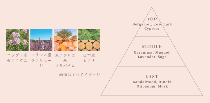 香料の一部に高品質な天然精油がブレンドされており、透明感のある果実と花々の甘さにゼラニウムやセージなどの穏やかなハーバルアクセントが加わっています。