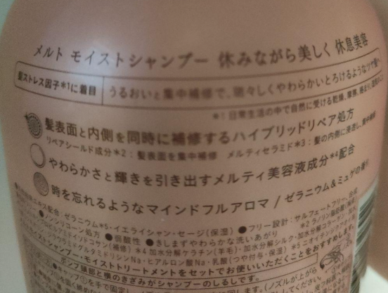 メルト シャンプーには保湿成分が豊富に含まれており、髪に水分を届けるように設計されています