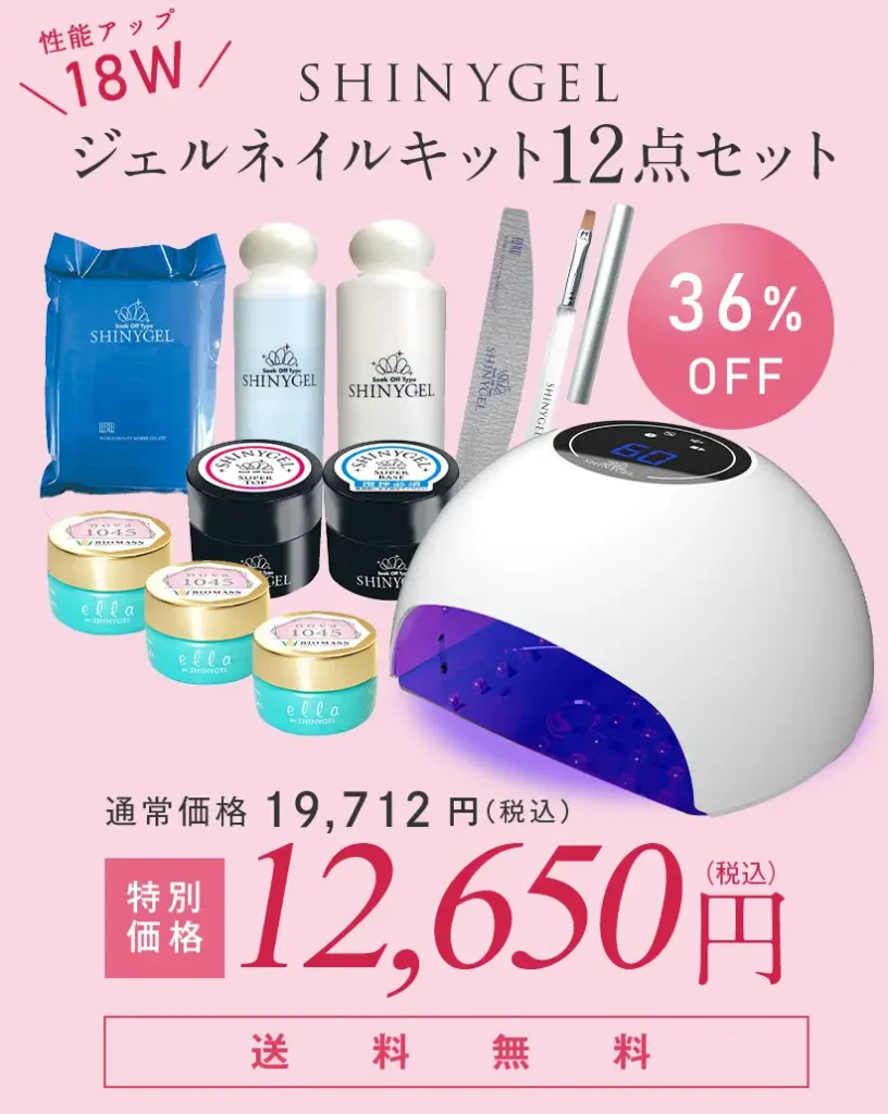 例えば18WのLEDランプ付きジェルネイルキットの価格は12,650円と他のサイトと同じですが、カラージェルを自由に選べる特典やレビュー特典なども用意されていて、初心者でも安心して始められる環境が整っています。