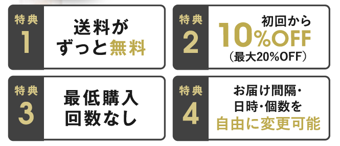 定期便に申し込むと、通常価格から常に10%OFFが適用された特別価格(最大20%OFF)で購入できます。
